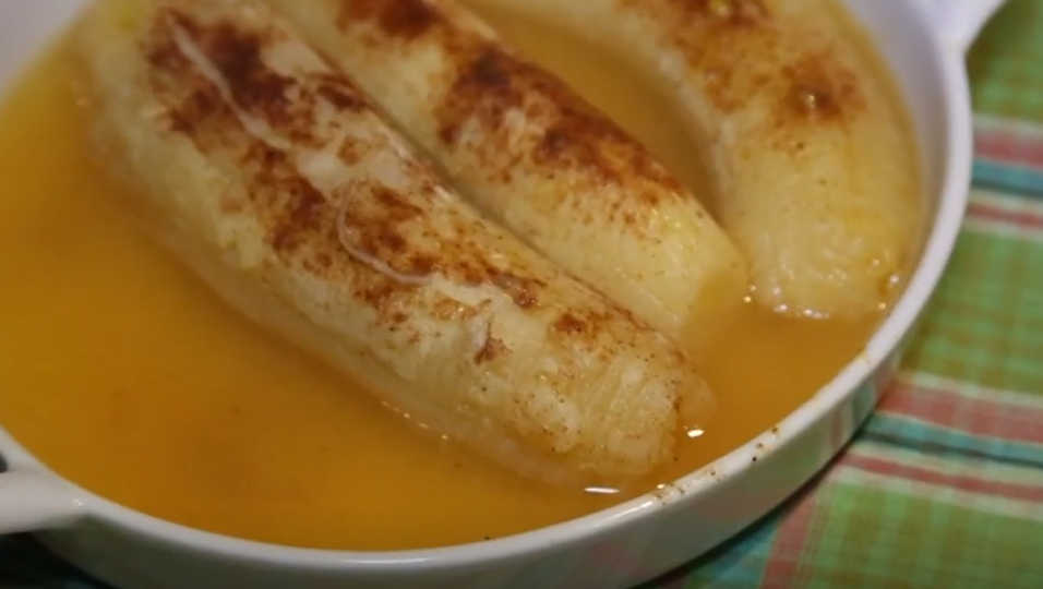 1. Em uma pequena travessa, coloque as bananas inteiras ou em rodelas, polvilhe a canela e acrescente o suco de laranja.