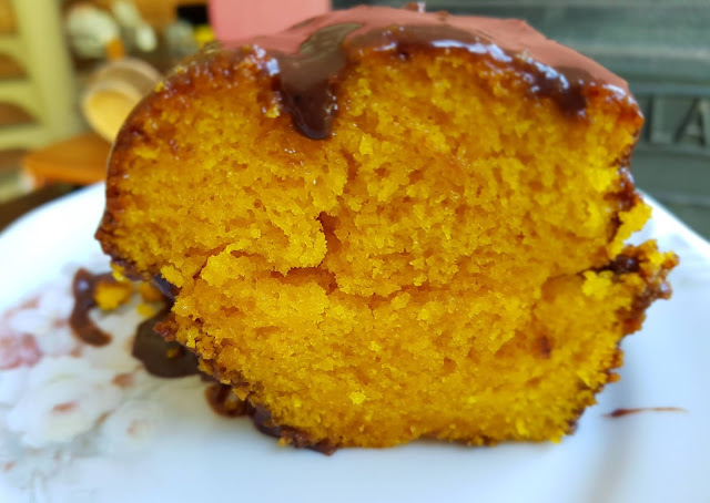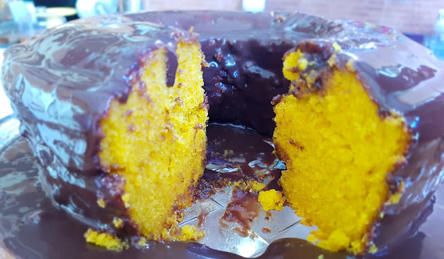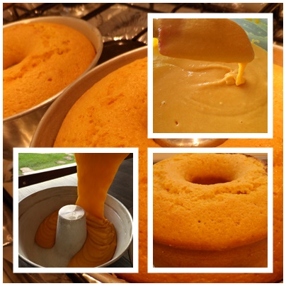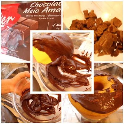 6. Misture bem e espalhe a calda ainda morna sobre o bolo assado.
