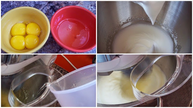1. Coloque na vasilha da batedeira os ovos e o açúcar e bata por 15 minutos em velocidade média. Coloque em uma vasilha e acrescente a essência e o fermento. Reserve.