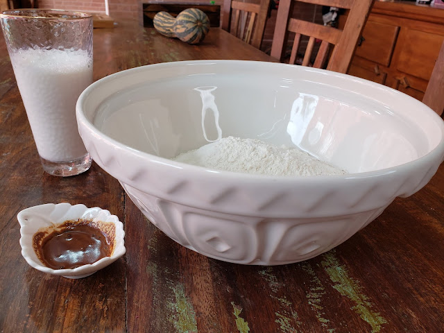 4. Em uma tigela grande, peneire toda a farinha de trigo, o açúcar, o bicarbonato de sódio, o sal e o cacau em pó.