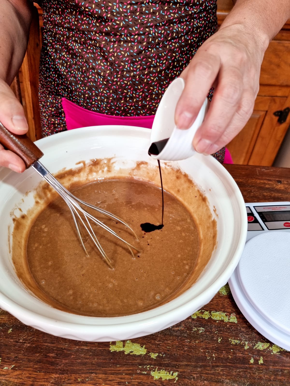 5. Separadamente, para descartar caso um deles esteja estragado, quebre os ovos, um a um e vá adicionando à tigela com a mistura de farinha, açúcar, bicarbonato, sal e cacau. Mexa bem e junte o óleo, o buttermilk, o vinagre, a pasta de café e o extrato de baunilha. Misture tudo com um fouet e, por fim, acrescente o corante em gel vermelho e mexa bem até obter uma massa uniforme.