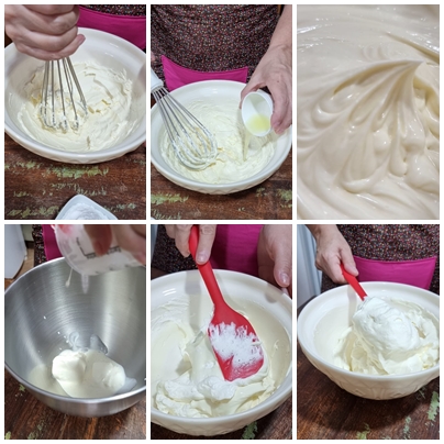 3. Com uma espátula de silicone, junte delicadamente o creme batido à mistura de cream cheese. Em movimentos lentos, passe a espátula pelas laterais da tigela, puxando o creme de baixo para cima em movimentos circulares e leves. Estará pronto quando o creme estiver liso e brilhante, mas não mexa demais para não perder o volume.