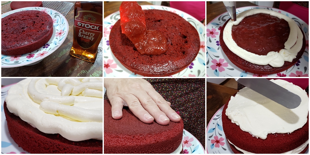 3. Umedeça este primeiro bolo com calda da geleia de morango ou com licor de frutas vermelhas. Eu utilizei licor Cherry Brandy, da marca Stock. Mas isto é opcional, você pode usar para umedecer apenas uma caldinha feita com partes iguais de água e açúcar (leve ao fogo por alguns minutos e deixe esfriar até o momento de usar).