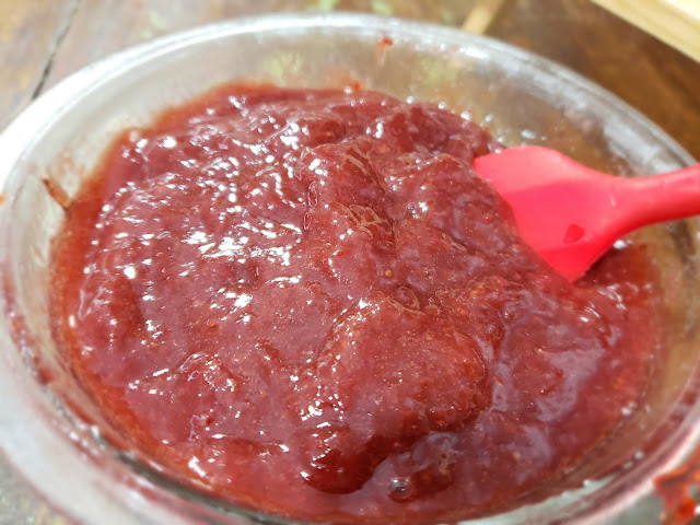 3. Junte o açúcar, mexa até dissolver e cozinhe por uns 30minutos, misturando de vez em quando com uma colher de pau, até conseguir uma geleia avermelhada, escura e bem brilhante, mas que dará a impressão de estar mole até esfriar.