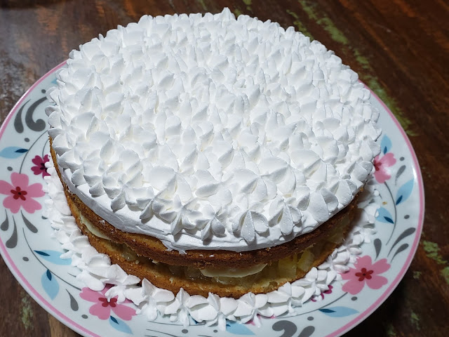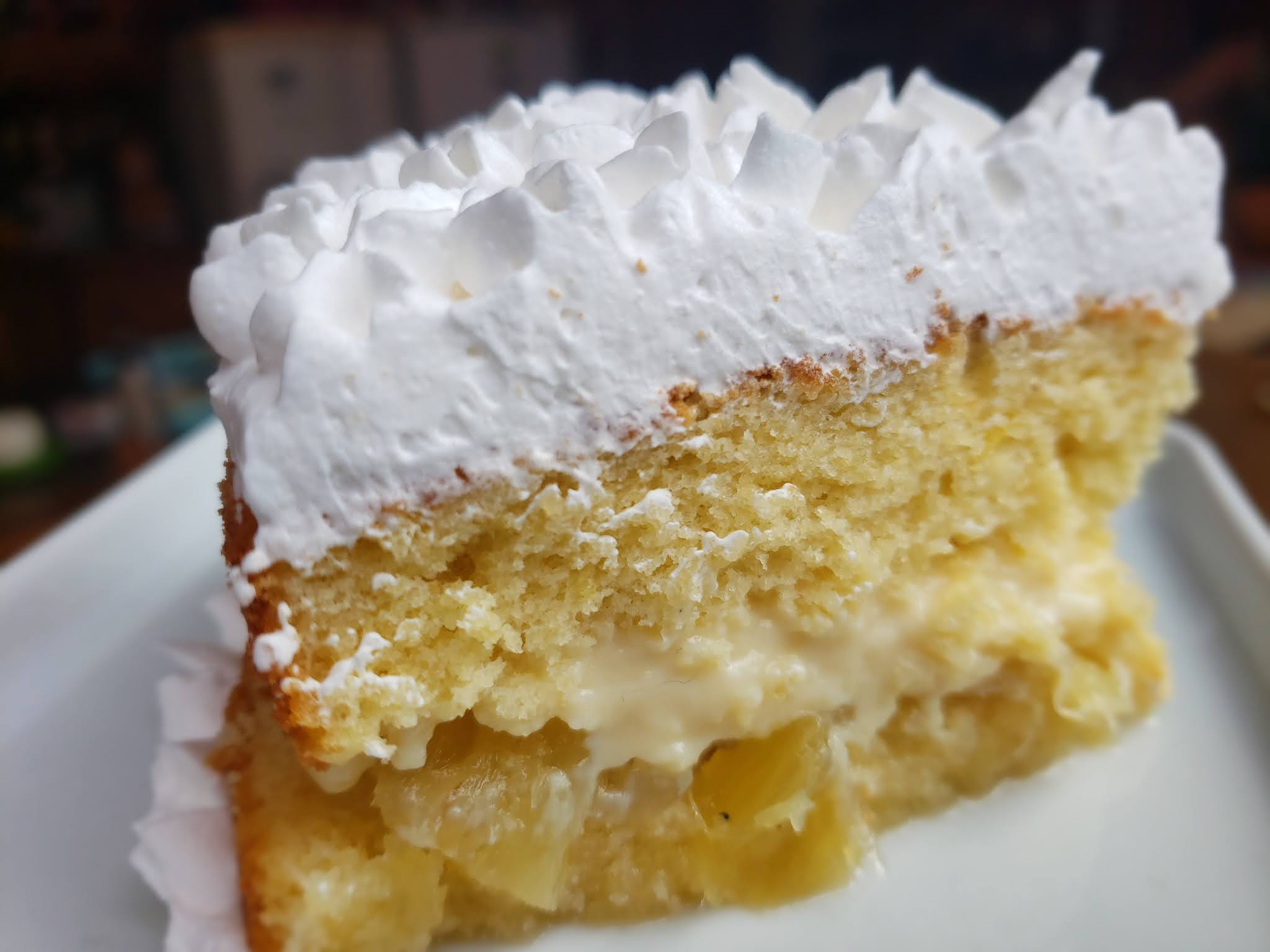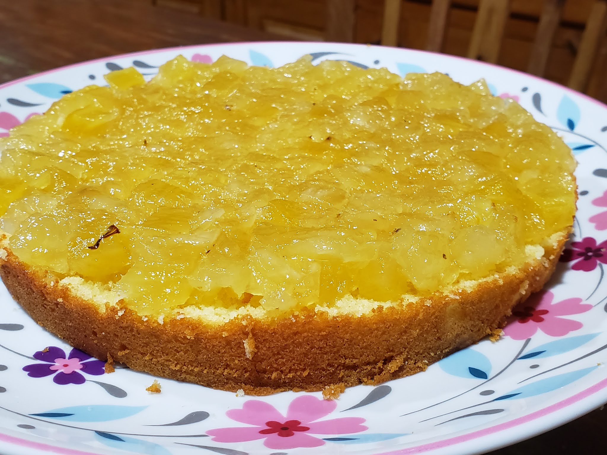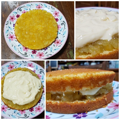 1. Caso seja necessário, nivele a massa para garantir uma superfície lisa. Coloque a primeira metade num prato de servir e espalhe o abacaxi em calda com generosidade. Não há necessidade de umedecer a parte de baixo, pois a calda já cumprirá esta função..