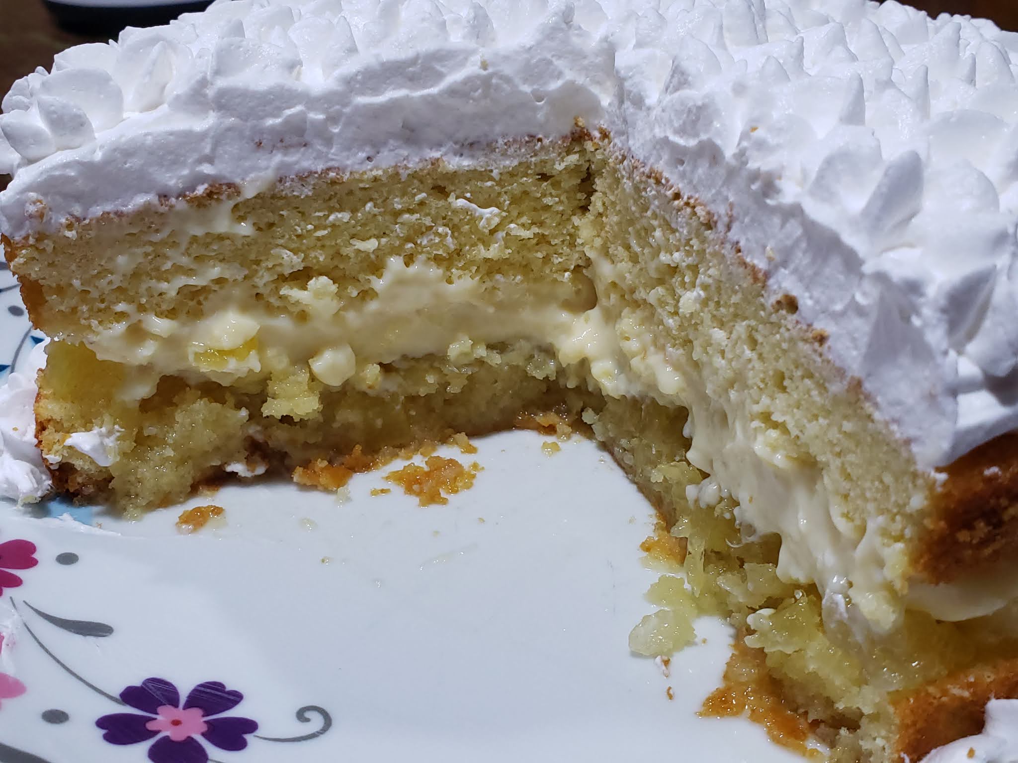 3. Coloque a outra metade da massa, cobrindo e decorando com o chantilly. Eu passei uma boa camada apenas por cima e deixei as laterais propositalmente descobertas. Para completar, fiz uma base e toda a cobertura com bico Wilton 1-M.