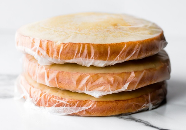 Os bolos são embrulhados em plástico e , em seguida, folha de alumínio. A primeira camada mantém o bolo firme e fresco e a folha de alumínio garante que não haja formação de gelo, que resultaria em umidade posterior.