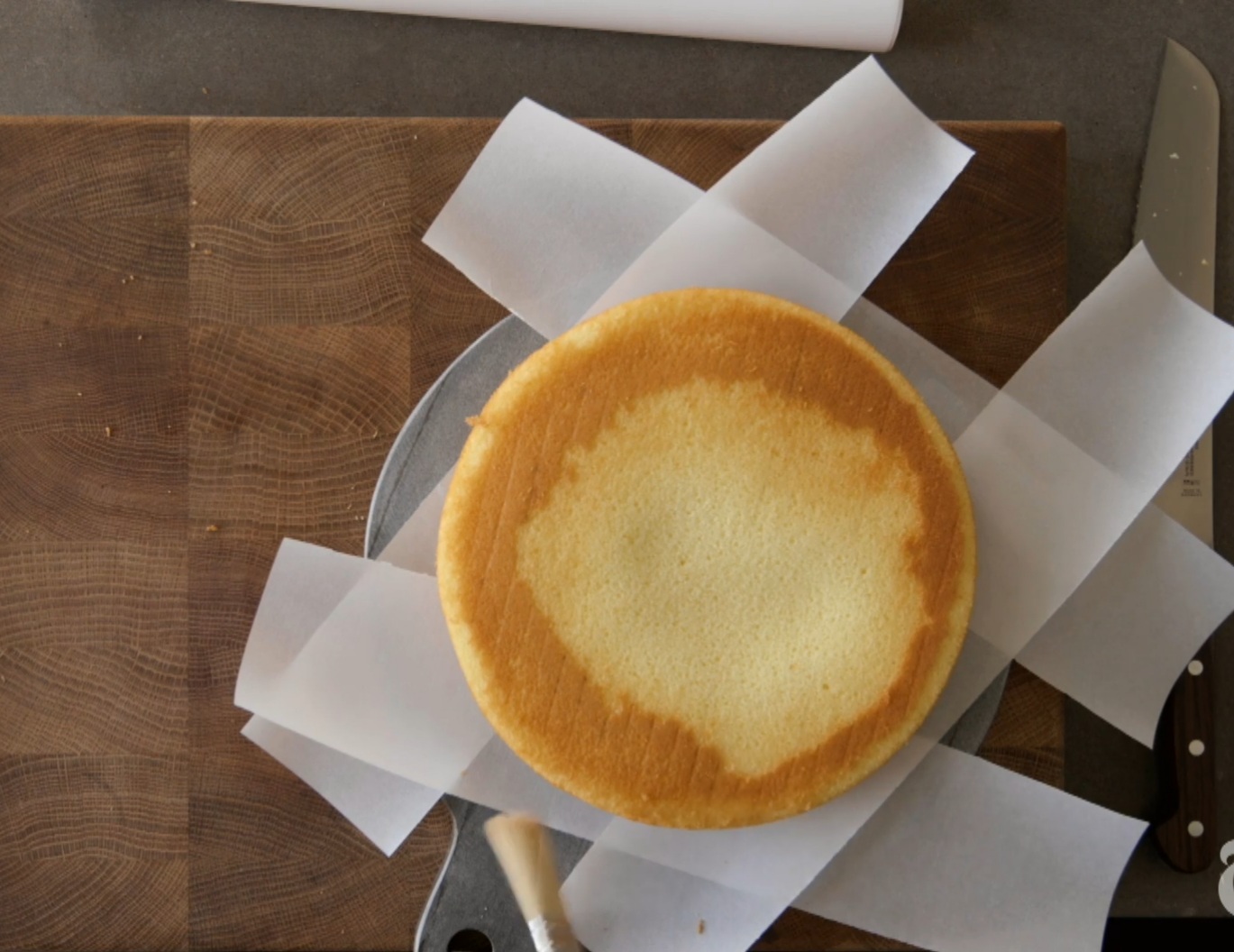 2. Assim que o bolo esfriar completamente, embrulhe-o em um plástico de congelar alimentos. Há vários modelos, de todos os preços, mas eu uso os mais simples, pois costumo forrar a base e o topo com folhasou tiras de papel manteiga. Estas não são obrigatórias, mas facilitarão sua vida na hora de desembalar.