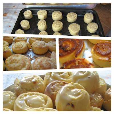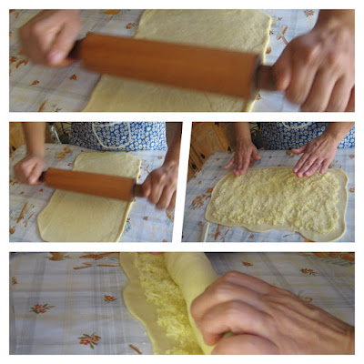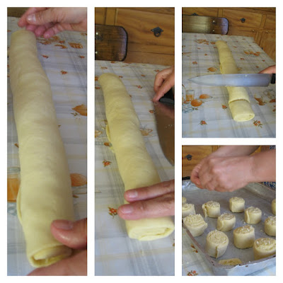 Divida a massa em 4 partes iguais e abra com o rolo, formando retângulos com espessura de meio centímetro. Espalhe o recheio e enrole cada retânculo como um rocambole. Corte em fatias com 3 cm de largura (ou pouco mais de dois dedos) e coloque-as deitadas cobre assadeira untada, deixando 2 cm de espaço entre elas.