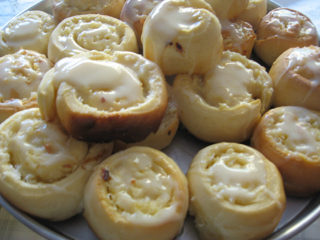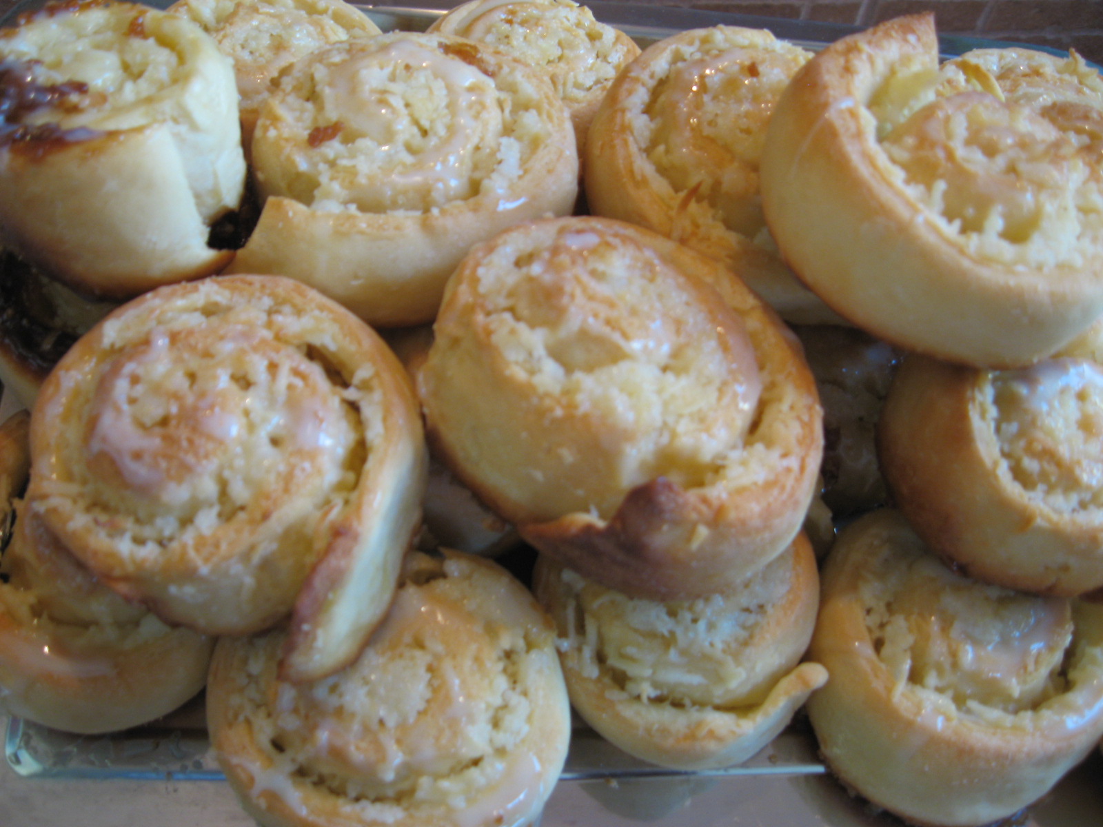Procurei a origem desses pãezinhos recheados, chamados de sticky buns (que seriam os pãezinhos com calda, bem úmidos). Segundo a versão corrente, eles teriam surgido no antigo Egito, Grécia e Roma, aprimorando-se na Europa Medieval e por fim chegando às Américas. Mas não se trata exatamente da “fatia húngara”. Os pães que mais se aproximam dessas são os Schnecken (caracol em alemão), de origem germânica, geralmente feito com creme de leite azedo, frutas secas e frutos secos ou canela.