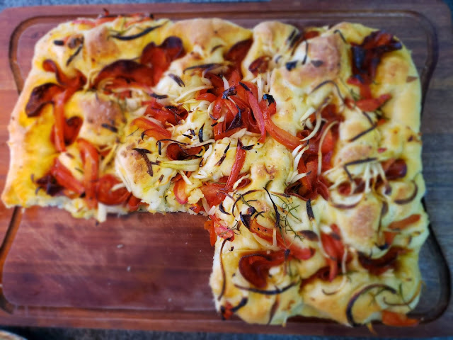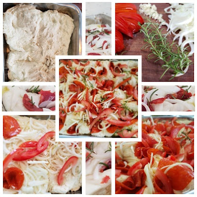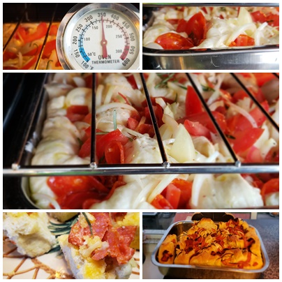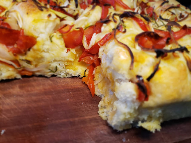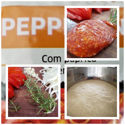 A focaccia de pepperoni é uma variante saborosa da focaccia clássica, que nada mais é que um pão rústico italiano, também chamada de Focaccia Genovese, e constituída de um pão chato (máximo 2 cm) no qual pincela-se com uma emulsão de óleo extra virgem de oliva, água e sal grosso. Admito que tenho uma queda paixão pela receita. Adoro ! Seja básica, com tomate ou outro recheio, não resisto a um bom pedaço de focaccia! O que proponho é uma variante realmente muito saborosa: recheei com pepperoni, tomate, cebola e alecrim, mas se quiser enriquecê-la ainda mais, com um ingrediente particular, fique à vontade. E se você tem pressa ou fome, não se preocupe, em um ambiente de temperatura amena ela fica pronta em apenas duas horas. Então, mão na massa …