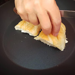 O pão deve ser cortado ao meio com um corte bem reto, assim quando passar a manteiga, ficará uniforme. É desta maneira que o tostadinho se espalhará como um todo no pão quando ele for para a frigideira.