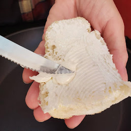 Há algum tempo, a mania nas padarias paulistanas é uma variação do tradicional pão na chapa, que já mostrei por aqui : trata-se do mesmo preparo com requeijão. Ainda que meio avessa à ideia, decidi testar, já que adoro pão com manteiga tostado no café.