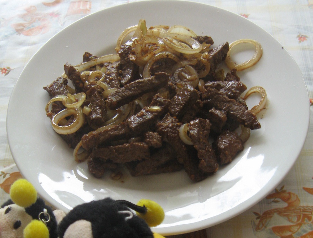 Retire os bifes, corte em fatias de cerca de 1 cm e retorne à frigideira para fritar novamente. Tire a carne e frite a cebola fatiada na mesma gordura. Acrescente novamente a picanha fatiada para dar conjunto e sirva imediatamente.