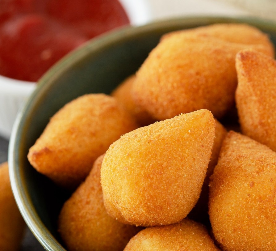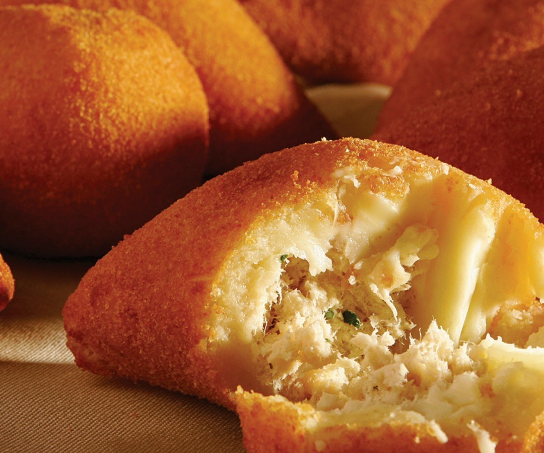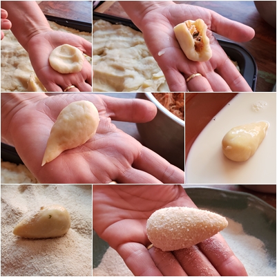 8. Mergulhe a coxinha no leite e passe na sequência na farinha de rosca.