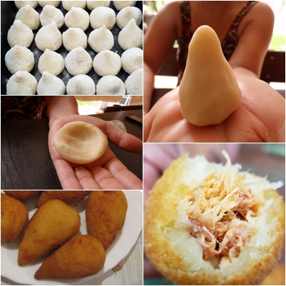 7. Para modelar as coxinhas, pegue uma pequena porção (aproximadamente 30g) e misture para que fique homogênea. Com o dedão da outra mão, pressione o centro da bola com delicadeza e coloque uma colher (sobremesa) de recheio. Com os dedos vá modelando até obter a forma de coxinha.