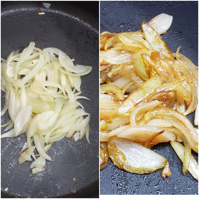 2. Em seguida, na mesma panela, caramelizar a cebola em fatias com um pouco de manteiga, uma pitada de sal e uma colher de café de açúcar (refinado ou mascavo). Reserve.