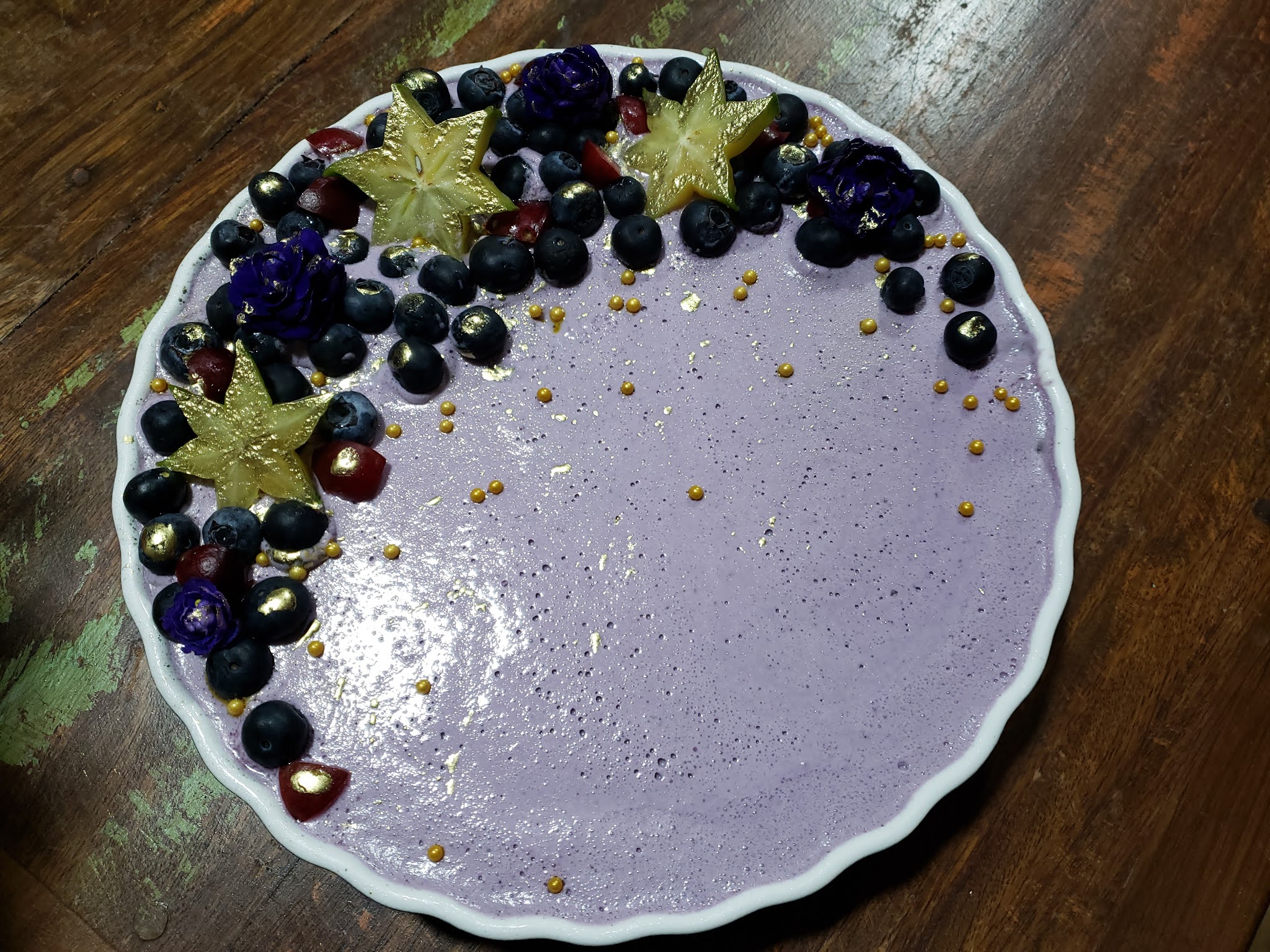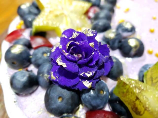 1. Distribua os ingredientes de modo a montar a forma de meia-lua: primeiro, salpique as choco balls douradas; em seguida, disponha todas as frutas de forma aleatória; e, por último, ponha as flores comestíveis.