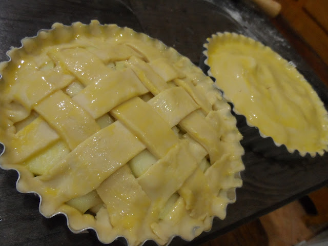 4. Pincele a torta com uma gema e espalhe o açúcar demerara uniformemente por cima da superfície. Leve ao forno pré-aquecido a 220ºC e deixe assar entre 45 e 55 minutos. Quando ela estiver dourada, faça o teste, enfiando a faca delicadamente em uma das aberturas da tampa: você tem de sentir as fatias macias, não deixando que percam sua forma ou virem um purê.
